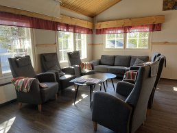 Majoitumme moderneissa ja hyvin varustelluissa mökeissä Kaunispään etelärinteellä huolletun latureitin tuntumassa.
